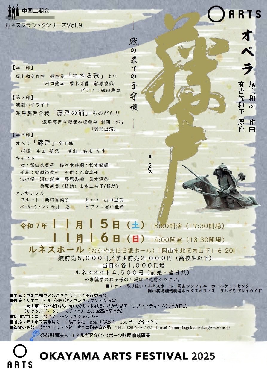 源平藤戸合戦をもとにつくられたこのオペラは、悲哀と慈悲の物語です。そして古典芸能の「能」の形式と西洋音楽が融合した新しい音楽です。史実に基づくお話をクラシック音楽と共にお楽しみください。